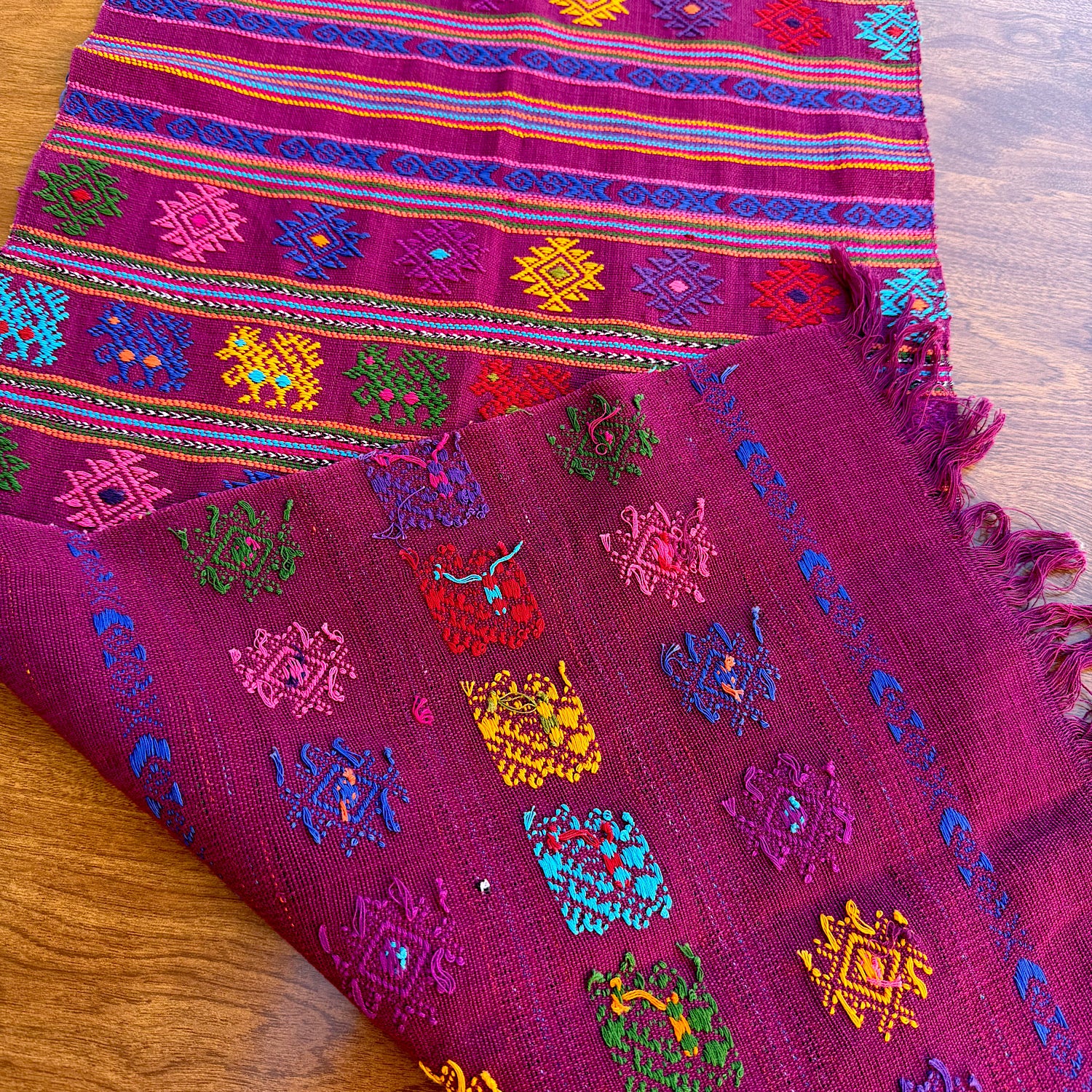 This table runner was handwoven on a traditional backstrap loom by artisans in San Juan Chamula, Chiapas, Mexico. Every thread is placed by hand, making each piece completely unique.