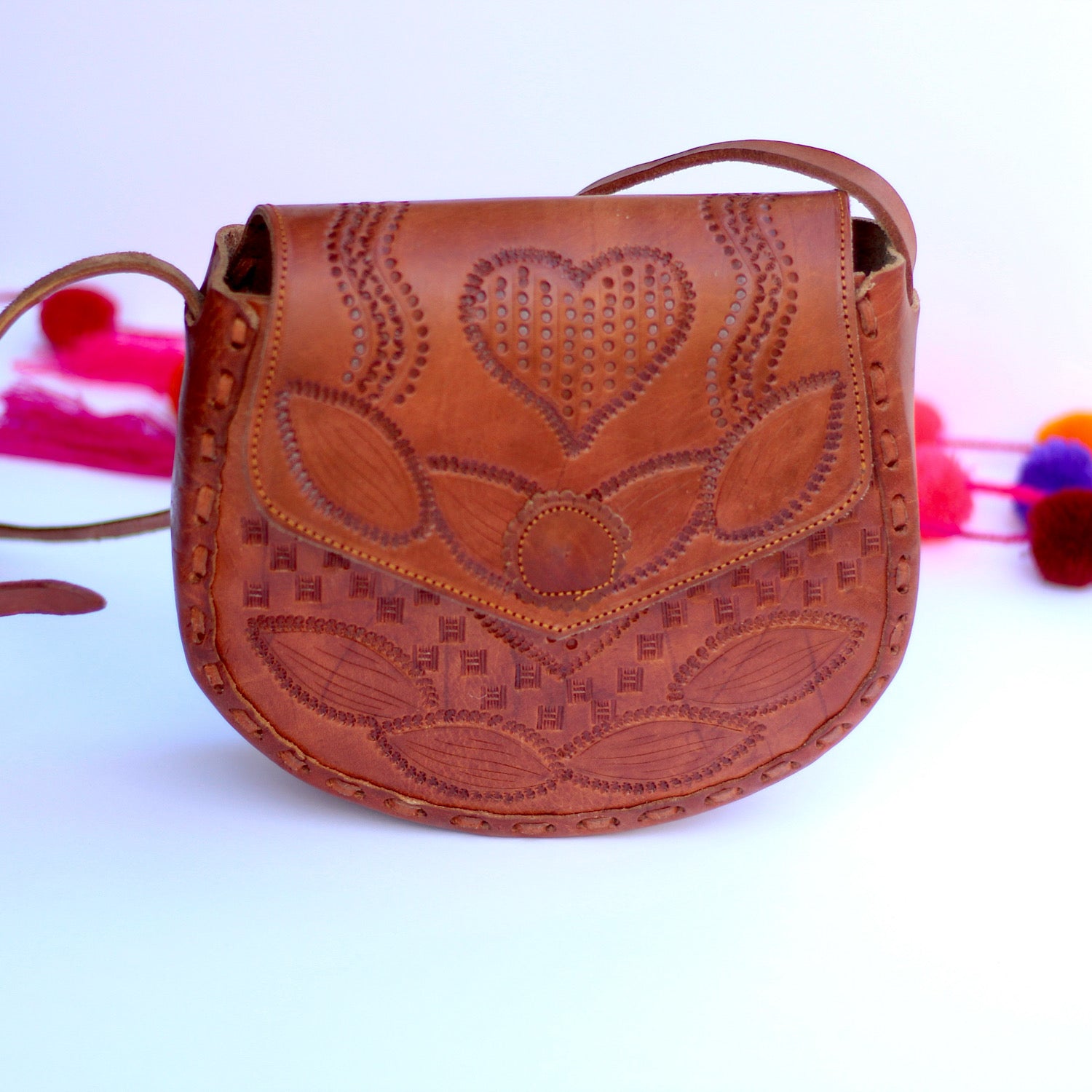Hand-tooled leather crossbody bag crafted by artisans in Chiapas, Mexico.