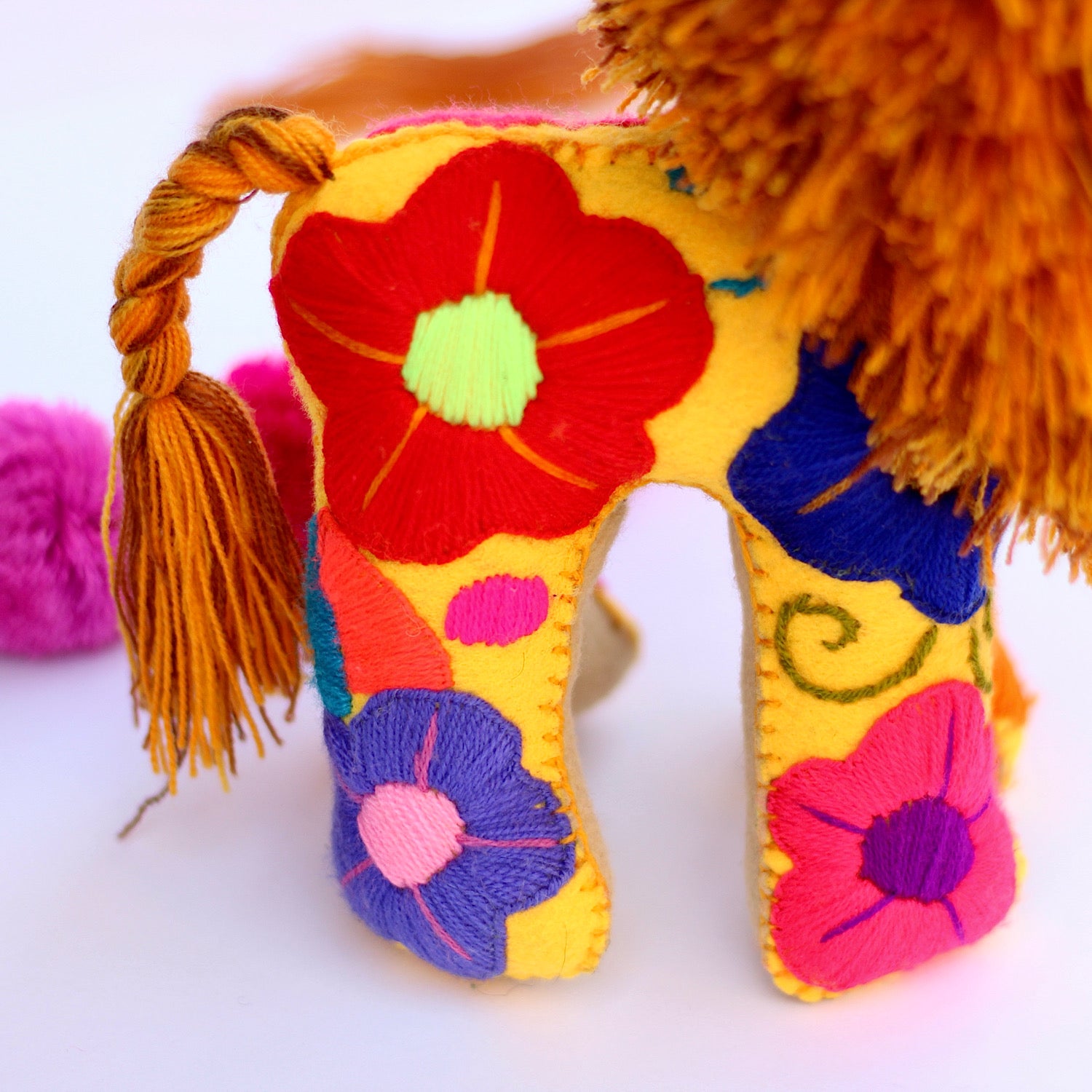 Handmade felt lion doll crafted in Chiapas, Mexico.